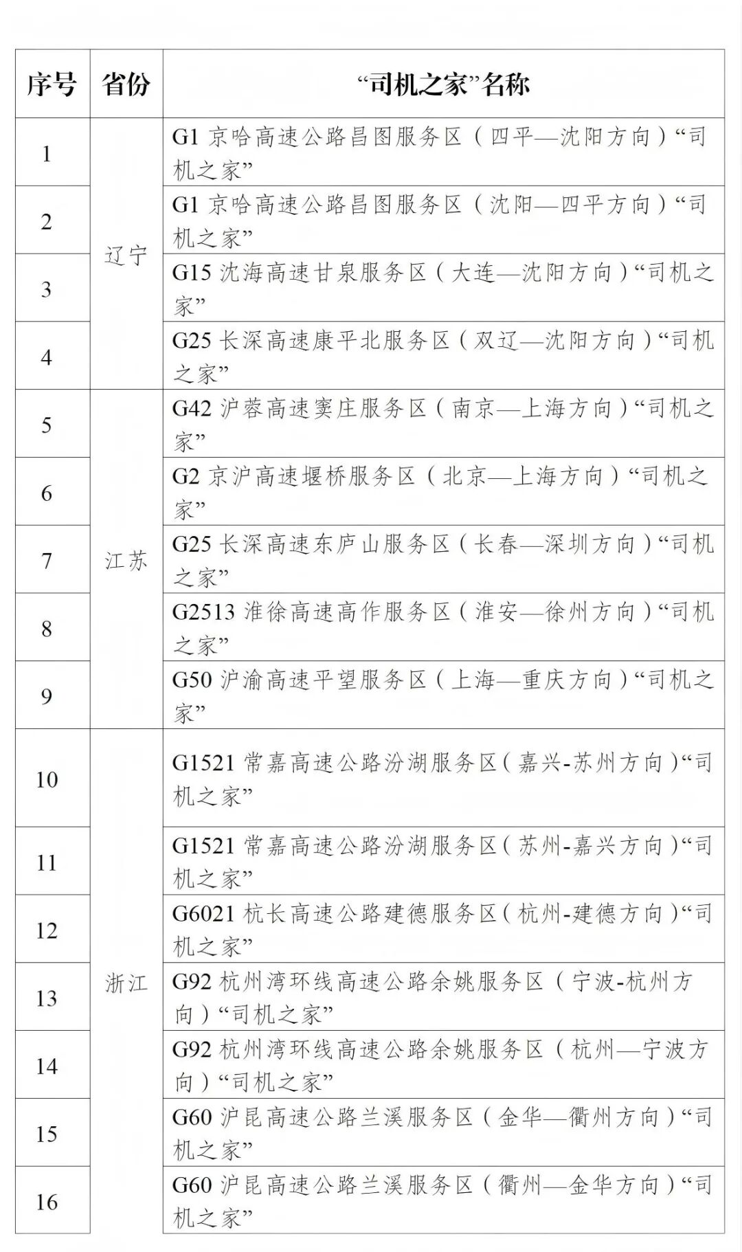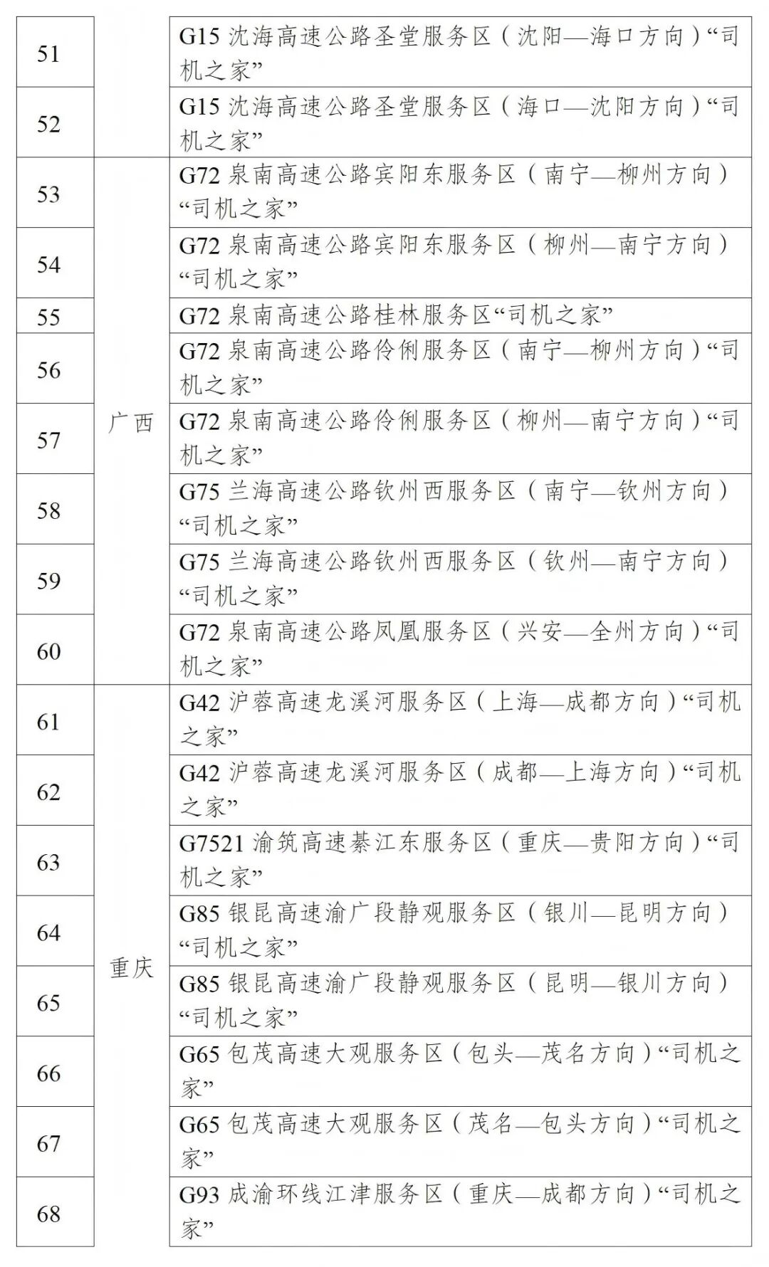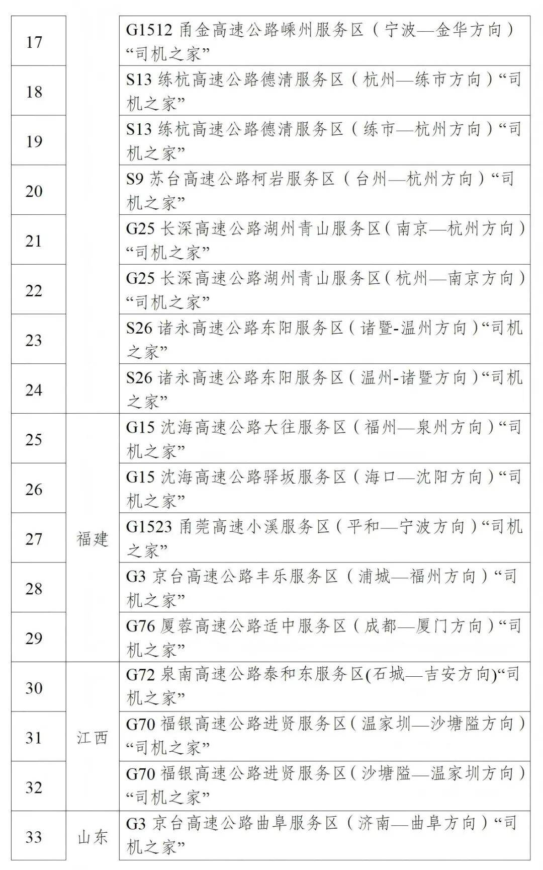 标准化规范化高速公路服务区 “司机之家”名单(第一批)