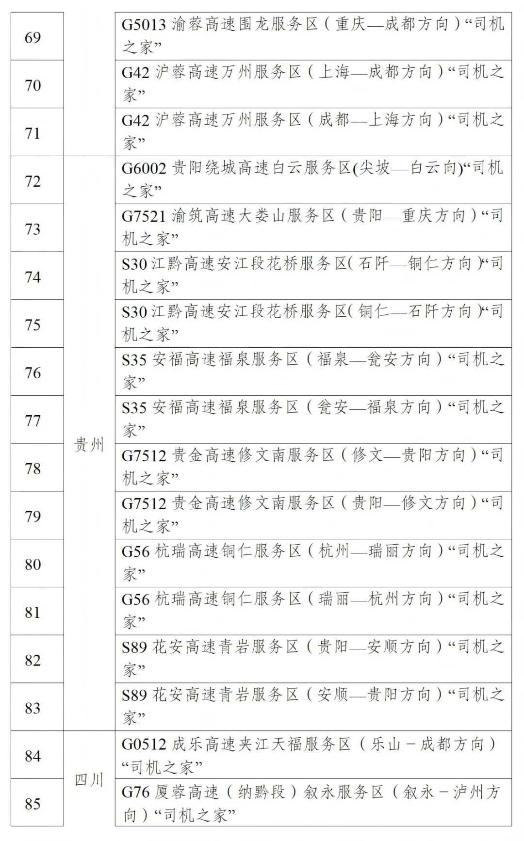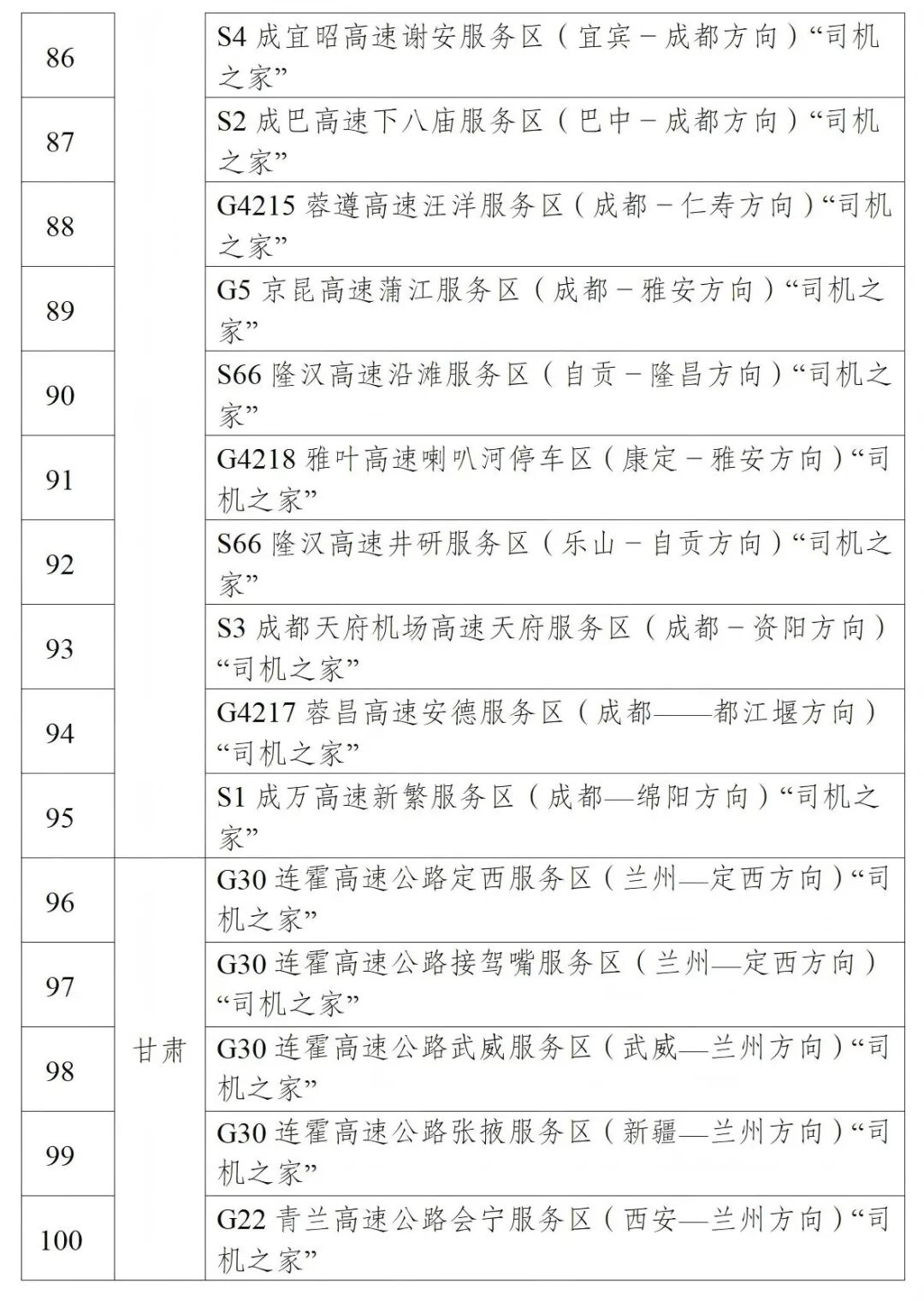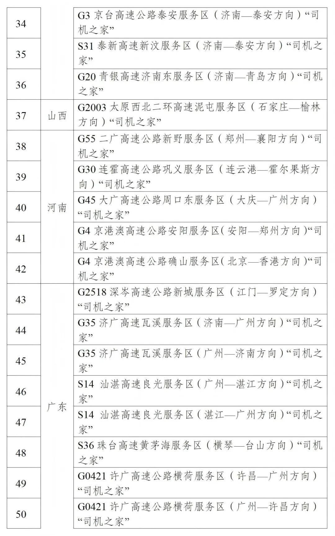 标准化规范化高速公路服务区 “司机之家”名单(第一批)