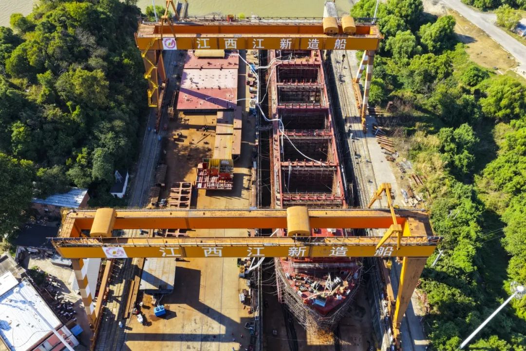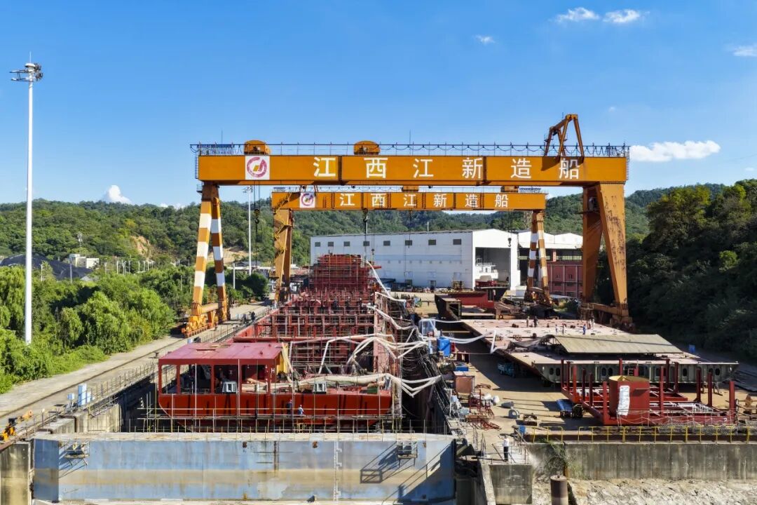 近日,由江西江新造船有限公司建造的全球最大、国内首制的万吨级纯电动高端智能海船——2艘“740TEU纯电动敞口集装箱船”的其中1艘在湖口县完成船体合拢,进入下水前舾装阶段。