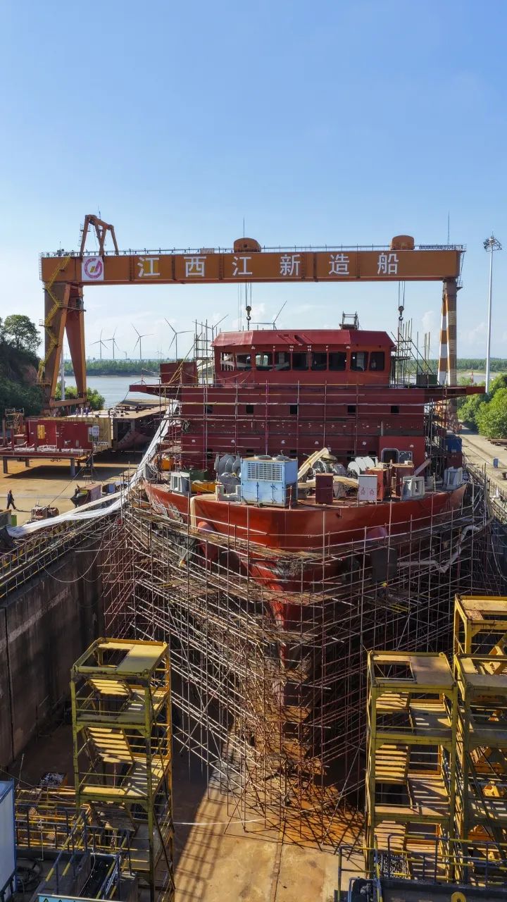 该船型配备智能集成平台、智能机舱系统,支持开阔水域自主航行,具有实时船周视角、全天候视觉感知、航线自主规划、无人驾驶、自主避碰及驾驶模式切换等先进功能。江西江新造船有限公司副总经理孙国志介绍:“该船目前正处于船体合拢和下水前舾装阶段,计划9月底下水,随后将开展码头舾装和调试工作,预计今年年底正式交付使用。”