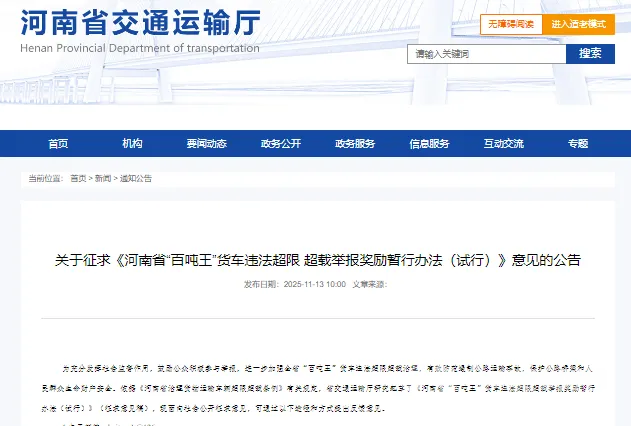 11月13日,河南省交通运输厅就《河南省“百吨王”货车违法超限 超载举报奖励暂行办法(试行)》公开征求意见。其中所称的“百吨王”货车,是指车货总质量超过100吨的货运车辆。举报“百吨王”货车(含大件运输车辆)违法行为,经查证属实的奖励1000元;举报货运源头单位违法装载放行“百吨王”货车出场出站,经查证属实的奖励1500元。