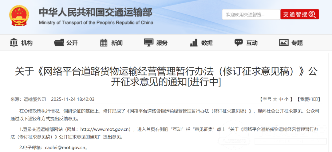 11月24日,交通运输部正式发布《网络平台道路货物运输经营管理暂行办法(修订征求意见稿)》,向社会公开征求意见至12月9日。此次修订距2020年原版《暂行办法》实施已逾五年,在总结前期实践经验基础上,首次明确网络货运“承运+撮合”分类监管框架,同步升级资质门槛、税务监管与数据互联要求,为行业从“野蛮生长”向“规范提质”转型划定清晰路径。