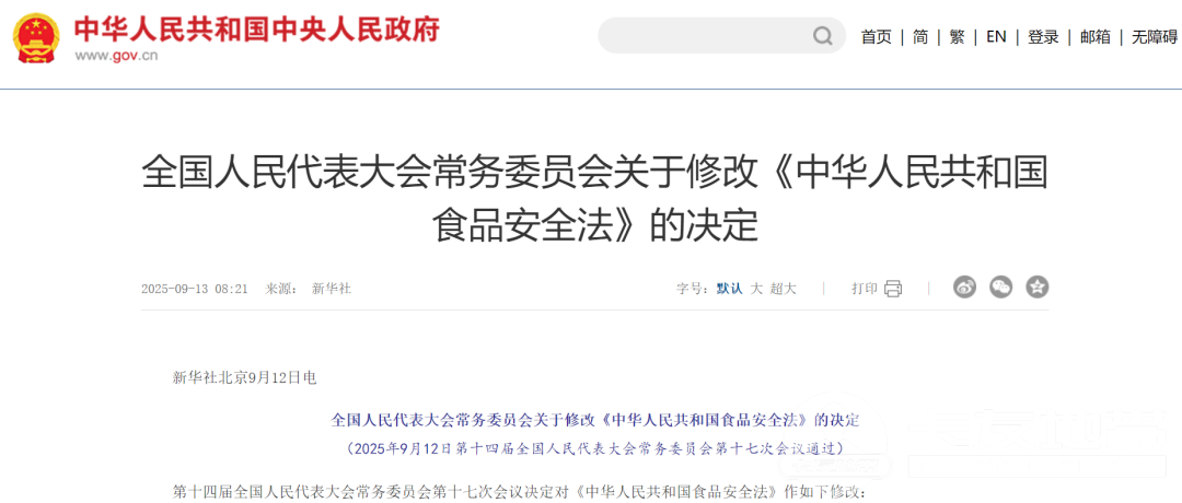 2025年9月12日,新修订的《中华人民共和国食品安全法》正式通过,2025年12月1日起全面施行。对重点液态食品道路散装运输实行许可制度。道路运输经营者从事重点液态食品散装运输,应当有符合保障食品安全要求的专用运输容器、作业人员和管理制度等,依法取得县级以上地方人民政府食品安全监督管理部门核发的准运证。