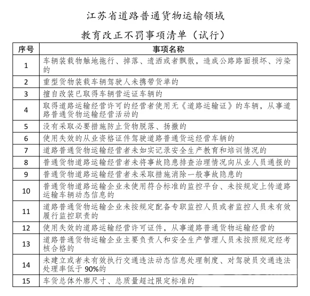 近日,江苏省交通运输厅印发《江苏省交通运输轻微违法依法不予行政处罚事项清单》,《清单》将于2025年12月1日起施行。其中对于普通货运轻微违法“教育引导、改正不罚”,设置60天观察期。