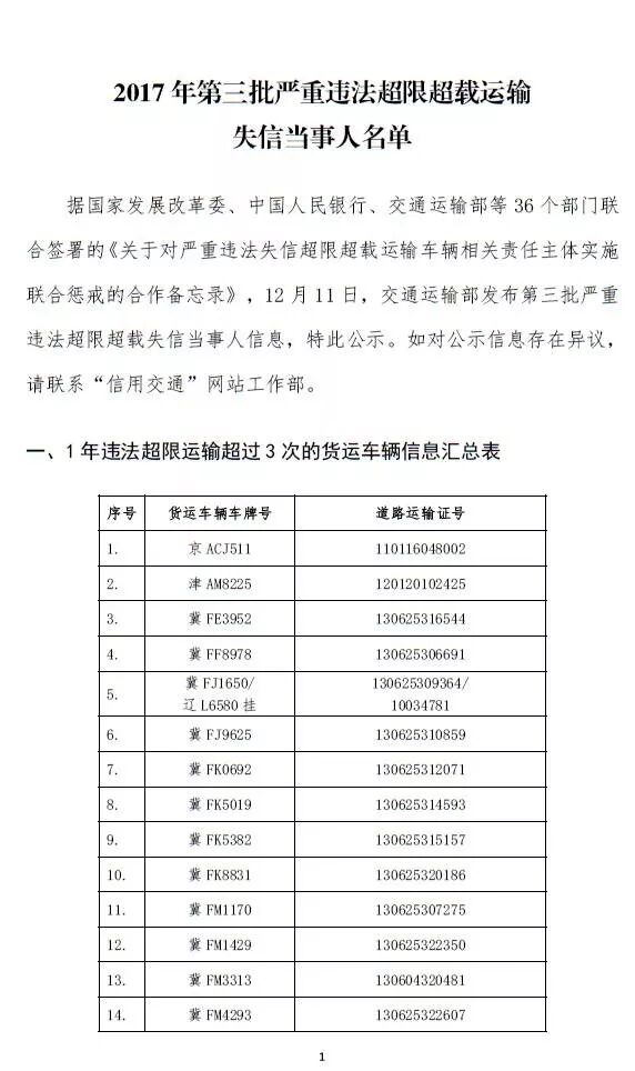 交通运输部公布第三批严重违法超限超载运输失信当事人名单