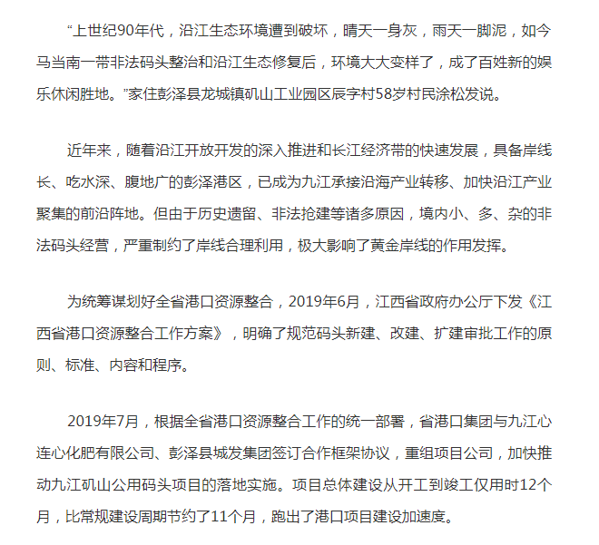 如今,九江矶山公用码头建成且具备运营条件,迈出了全省港口资源整合项目的一小步,却是推动全省港口一体化发展的一大步。彭泽县城发集团建设发展部相关负责人吴疆琳介绍:“在九江矶山工业园就业的工人基本上是本县或者周边县区的居民,每人每天能赚200元至300元。”