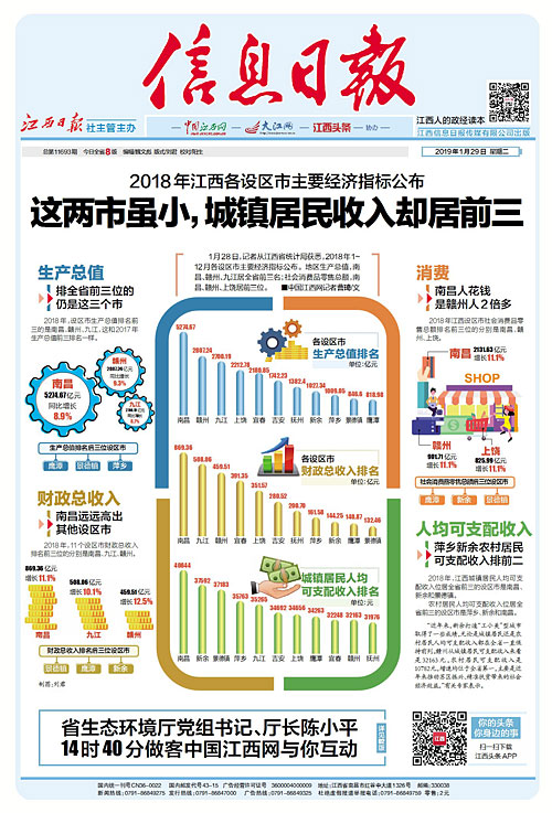 1月28日,记者从江西省统计局获悉,2018年1~12月各设区市主要经济指标公布。地区生产总值,南昌、赣州、九江居全省前三名;社会消费品零售总额,南昌、赣州、上饶居前三位。■中国江西网记者曹琦/文