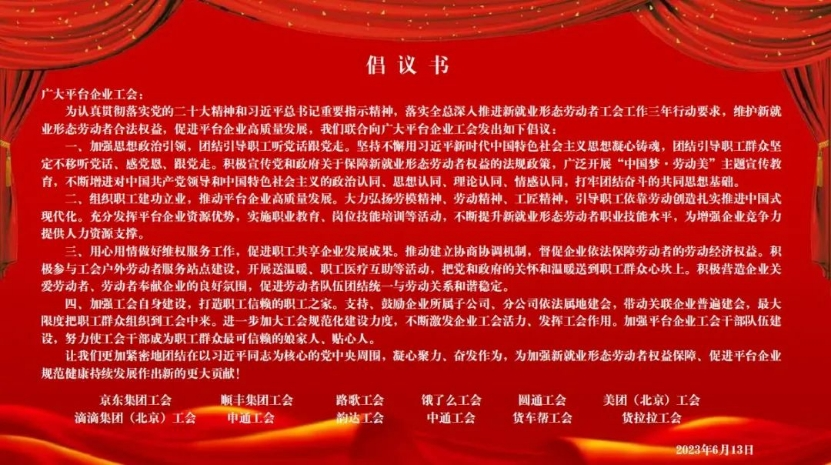 会上,京东、顺丰、美团、滴滴、饿了么和满帮集团旗下货车帮等12家头部平台企业工会联合发出倡议,呼吁广大平台企业落实全总“三年行动”要求,维护新就业形态劳动者合法权益,促进企业高质量发展。