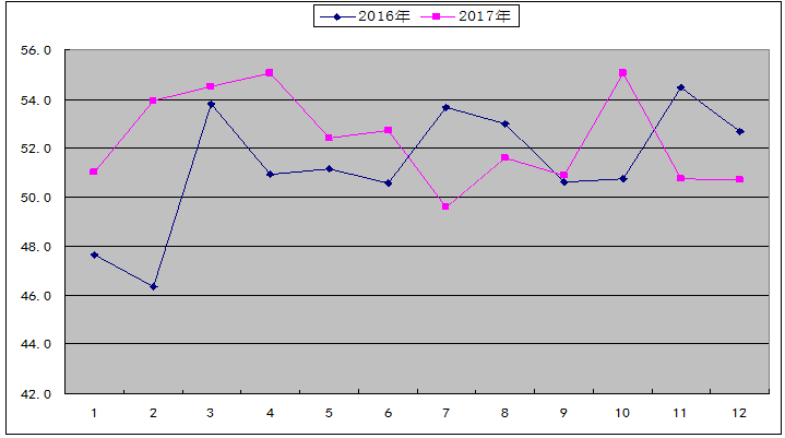 2017年,新订单指数一直保持在51%以上较高的水平,3月份高达60.5%,为自数据调查以来的第二高点。全年该指数均值达到55.1%的较高水平,高于2016年同期3.0个百分点,显示2017年仓储行业订单良好,客户需求充足。从全年变化看,上半年新订单指数平均水平高达56.6%,高于下半年2.9个百分点。全年新订单指数呈现“前高后低”的走势,我们认为一方面是因为下半年大宗商品价格整体涨势迅猛,下游行业成本明显增加,采购趋于谨慎所致;另一方面也是因为前期订单量增长较快,基数较高。