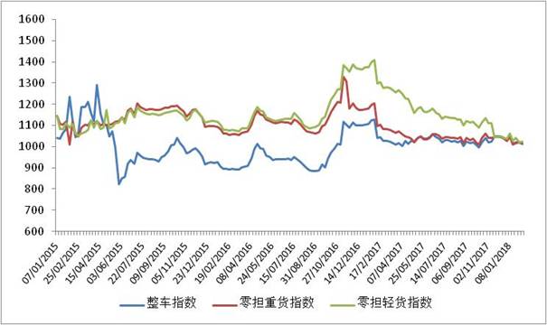 各车型指数涨跌不一,其中整车指数、零担重货指数环比回落,零担轻货指数小幅回升。其中,整车指数为1014.41点,比上周回落0.58%;零担重货指数为1012.78点,环比回落0.59%;零担轻货指数为1022.08点,环比回升0.08%。