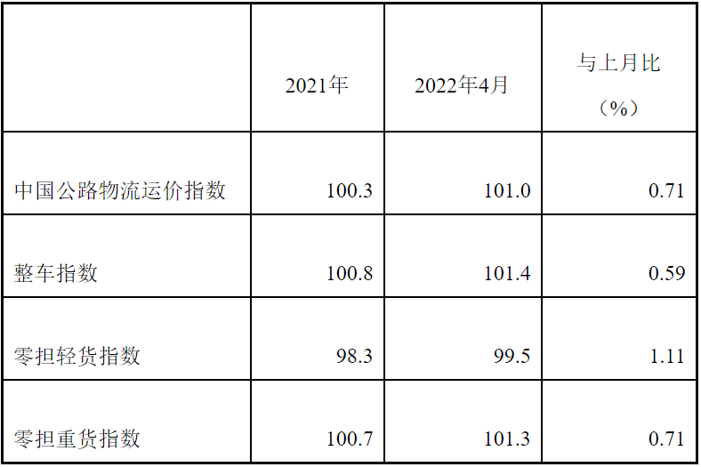 2022年4月份,由中国物流与采购联合会和林安物流集团联合调查的中国公路物流运价指数为101点,比上月回升0.71%,比去年同期增长0.84%。从周指数看,第二、五周运价指数回落,第一、三、四周运价指数环比回升。