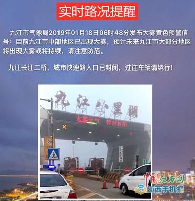 记者了解到,因大雾影响,高速九江站入口,二桥、赛城湖入口、城市快速路入口已封闭。