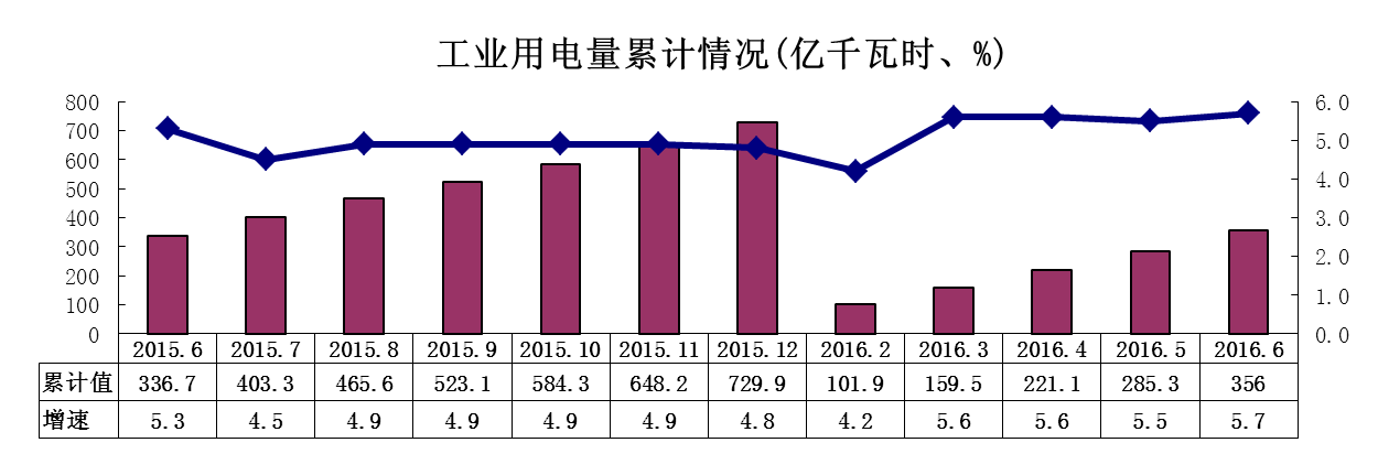 (一)工业用电量增速小幅提高。我省工业用电量延续去年以来平稳增长态势,走势继续好于全国。上半年,全省工业用电量356亿千瓦时,增长5.7%,增速高出全国平均水平5.2个百分点,居全国第4位。从走势来看,上半年工业用电增速较1-5月小幅提高0.2个百分点,增速在低位小幅波动,反映当前工业经济运行平稳,但下行压力依然较大。