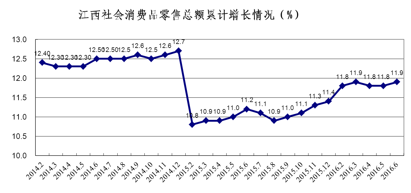 上半年,我省社会消费品零售总额完成2997.4亿元,增长11.9%,增速居中部第2位,总量居末位。各省按增速排名依次为:安徽12.1%、江西11.9%、河南11.5%、湖南11.4%、湖北11.4%、山西6.4%。